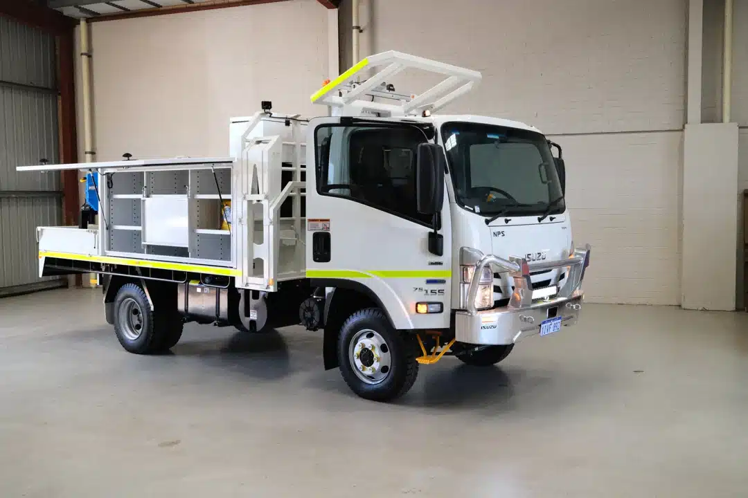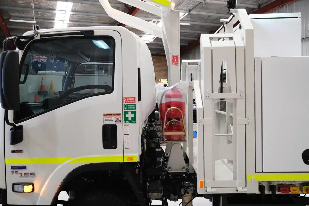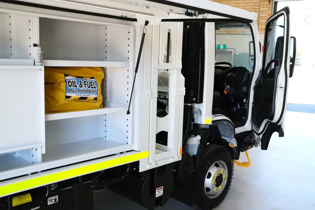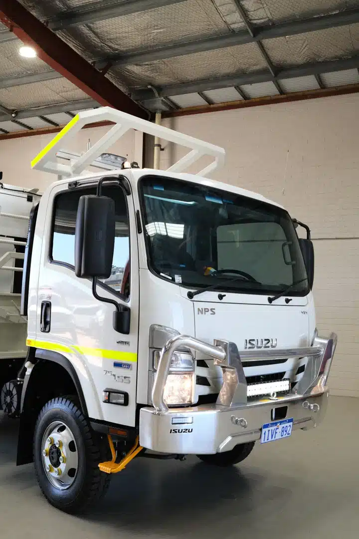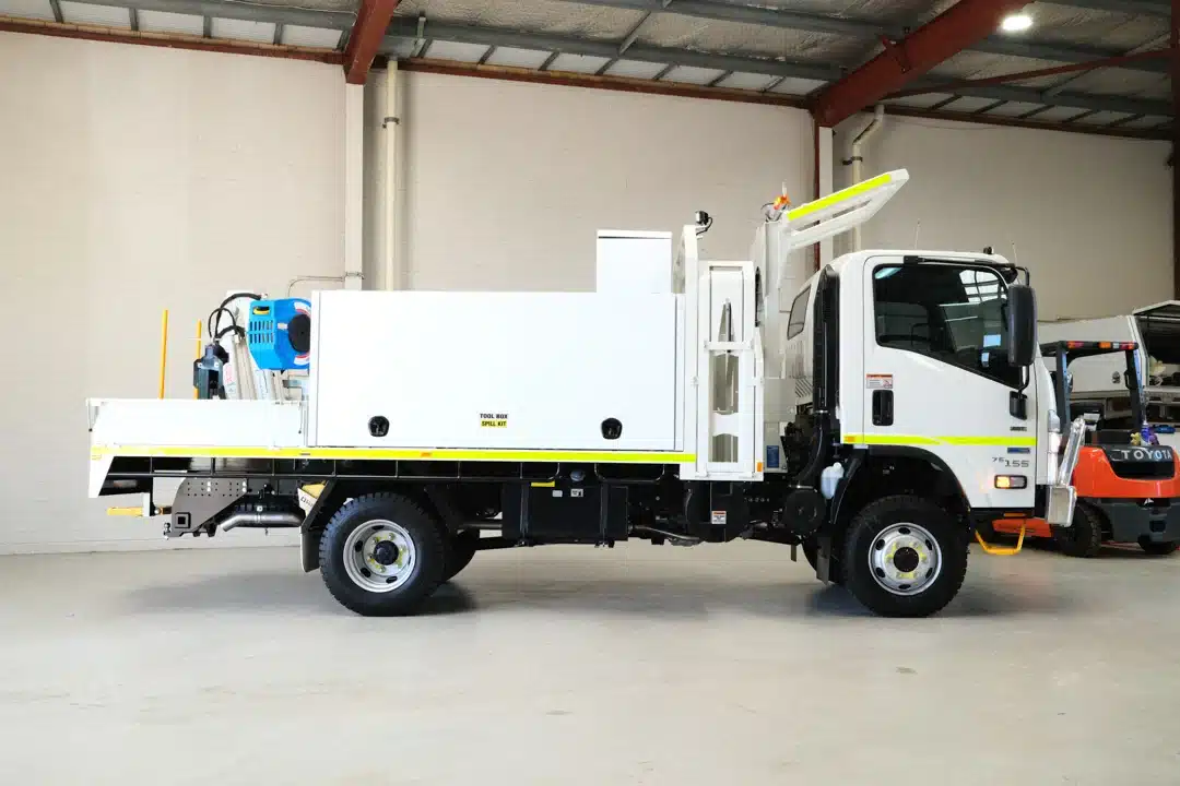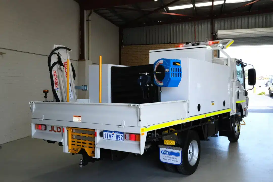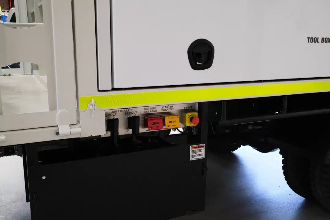 The Mine Spec Fitter Truck is engineered to enhance the functionality and safety of industrial operations. This robust vehicle features a comprehensive dispensing system with high flow diesel capabilities and a range of tank capacities, tailored to meet diverse operational needs. Certified ROPS/FOPS, a CAT jump start receptacle, and strategically placed low mount refill points underscore its practical design. The cabin and external safety measures include dual pole battery isolation, multiple emergency stops, and a full suite of LED lighting for optimal visibility and safety. Additionally, it is equipped with overfill protection for both diesel and grease tanks, an oil spill kit, and fire suppression resources to maintain stringent safety standards. Essential tools and components are securely stored, ensuring durability and readiness. Available for immediate deployment from our Perth office or delivered directly to your site in WA, this service truck is prepared to support the rigorous demands of any project.